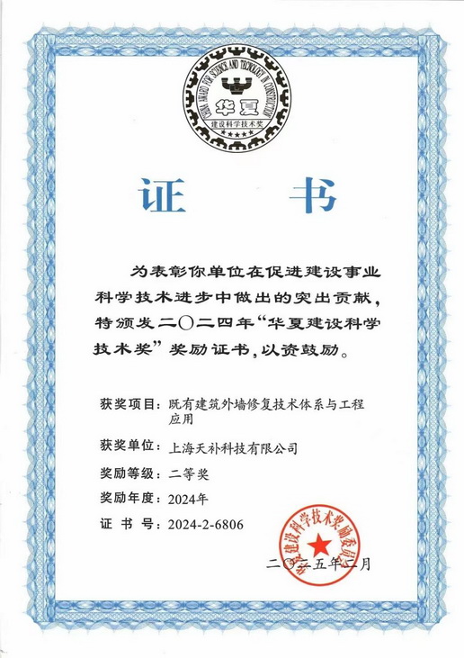 近日,2024年度华夏建设科学技术奖获奖名单正式揭晓,备受瞩目的建筑领域科技创新成果纷纷亮相。其中,园区企业上海天补科技有限公司联合中国建筑科学研究院、上海市建筑科学研究院等共同申报的“既有建筑外墙修复技术体系与工程应用”项目脱颖而出,一举斩获华夏奖二等奖。这一荣誉不仅是对天补科技技术创新实力的高度认可,更为整个建筑外墙修复行业树立了新的标杆。